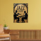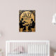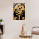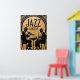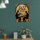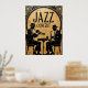 Esta pintura estilizada es una representación gráfica de un concierto de jazz. Dos músicos, representados en siluetas negras, están sentados y cantando, uno tocando una trompeta y el otro un saxofón. El fondo es un gran círculo dorado texturado con las palabras "JAZZ CONCERT" en negrita. La obra de arte tiene una estética minimalista y elegante, combinando el ambiente clásico de jazz con un estilo moderno y decorativo.
