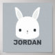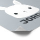 Este diseño presenta un pequeño conejito con nombre personalizado en estilo de letra sans serif moderna gris sobre fondo gris claro.