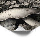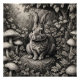 Hermoso conejo en un jardín de setas con árboles y hojas dibujando.