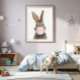 Conejo soplando una burbuja de chicle rosa. Arte de guardería para decorar la habitación de tu hijo.