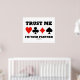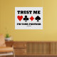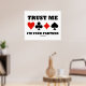 Muestra tu lado de jugador de puente irónico con este poster que presenta los cuatro palos de cartas junto con el dicho que a menudo se escucha en la mesa del puente: "Confía en mí, soy tu compañero".