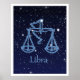 Poster con el símbolo de Libra en azul plateado suave, cubierto con las estrellas de la constelación, contra un fondo estrellado del cielo clasificado de azul oscuro a negro.