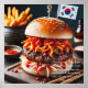 Experimente la comodidad de los sabores coreanos con esta grandiosa hamburguesa Bulgogi. Una jugosa parrilla de ternera, marinada en una delicada salsa bulgogi, está cubierta con una mancha kimchi angosta, una llovizna ligera de gochujang mayo y una espoleta de semillas crujientes de sésamo, todo enclavado entre un bollo de leche tostada. Una pequeña bandera surcoreana le da un toque de orgullo a Corea, mientras que los palillos y un lado de patatas fritas de tempura crujiente completan esta delicia culinaria coreana.