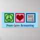 Peace Love Accounting. Un lindo regalo contable para un CPA que trabaja en una oficina durante la temporada de impuestos con un signo de paz, corazón y una calculadora fresca.