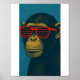 A stylized illustration features a chimpanzee wearing red, horizontal-slatted sunglasses. The monkey's face is rendered in a textured yellow, contrasting with its dark blue fur. The background is a solid teal color, providing a simple backdrop. The image has a playful and slightly retro vibe. The sunglasses add a touch of humor and coolness to the animal portrait.