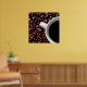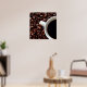 Fotografía de una taza de café blanca con café negro, con fondo de granos de café.