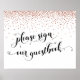 Las piezas de esta colección muestran frases destacadas representadas en un tipo de letra distintivo y elegante acentuado por los corazones, junto con confetti de color cobre. En este cartel, el texto del guión dice "por favor, firma nuestro libro de visitas". Todas las capas se agregaron por separado y se dejaron sin bloquear para que pueda cambiar el tamaño o la reposición según sea necesario, junto con cualquier otra adición que considere adecuada. // 80 //