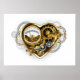 Corazón mecánico, volumétrico, de vapor punk con manómetro de presión, acero y engranajes dorados sobre fondo blanco. Estilo Steampunk.