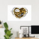 Corazón mecánico, volumétrico, de vapor punk con manómetro de presión, acero y engranajes dorados sobre fondo blanco. Estilo Steampunk.