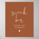Este letrero de bar cuenta con un elegante tipo de letra manuscrita y un moderno diseño minimalista con una combinación de terracota boho y color blanco. Cambie fácilmente los colores de fuente y el color de fondo para que coincidan con el estilo de evento. Par con elementos adicionales de la colección CORIANDER para obtener un aspecto coherente.