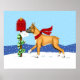 Este Fawn Boxer se pasea por la nieve para llevar sus saludos navideños al buzón con su bufanda de punto rojo. Las obras de arte de navidades de Danes-R-Us traerán una sonrisa a la cara de cualquier amante de los perros esta temporada.