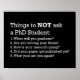 Divertido poster con una lista de cinco cosas para no pedirle a un estudiante de doctorado. 1. ¿Cuándo te graduarás? 2. ¿Estás escribiendo tu tesis? 3. ¿Cómo va tu investigación? 4. ¿Tu artículo ya se publicó? 5. ¿En qué año vuelves?