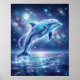 A joyful cosmic dolphin leaps through a radiant star tide, its sleek body formed from luminous nebula gradients and shimmering stardust. Trails of glowing particles follow its motion, capturing energy, freedom, and playfulness. The reflective cosmic ocean and vibrant sky enhance the sense of movement and life. This uplifting artwork symbolizes happiness and fluid motion, making it perfect for modern interiors, ocean lovers, and dynamic wall decor that brings light and positivity into any space.