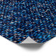 Coja recta con hilo naranja sobre tela de denim blanqueada con borde lateral, sobre fondo de denim azul, lugar de texto, espacio de copia. Marco de tela de jeans azules denim. Parche de doble color para los jeans brutos