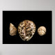Fotografía de la vida de tres conchas de conchas vistas alineadas, la más grande en el medio, sobre un fondo negro.