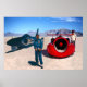 A composite image featuring five-time land speed record holder Craig Breedlove and three-time LSR holder Art Arfons posing together on the Bonneville Salt Flats with their respective jet cars, "Spirit of America" and "Green Monster" circa 1964.