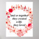 Hermoso tapiz con las palabras "Y así juntos crearon una vida que aman", y tomados de la mano, rodeados por una corona de flores. También se puede descargar.