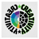 Esta imagen muestra un logo circular con la palabra "CREATIVITY" escrito en negrita, en letras negras alrededor del perímetro. La palabra es reflejada, con "CREATIVIDAD" apareciendo tanto en el sentido de las agujas del reloj como en el contrario. Dentro del círculo, un diseño en blanco y negro que se asemeja a un objetivo o a una rueda llena el espacio. A la izquierda de la rueda hay una gráfica circular colorida con segmentos en color morado, azul, azul claro, verde y amarillo. Dos estrellas, una verde y otra negra, se colocan en la parte superior e inferior de la rueda, respectivamente. El diseño sugiere una conexión entre creatividad y poder de las ideas. Las letras negras y audaces y los colores contrastantes crean un fuerte impacto visual, enfatizando la importancia de la creatividad.