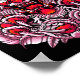 La cabeza de un temible dragón rojo domina el centro de la imagen, con los ojos llenos de furia. La boca del dragón está abierta de manera amplia, revelando dientes afilados, y sus garras se extienden, agarrando cráneos. El fondo está decorado con motivos florales intrincados y líneas de movimiento.