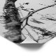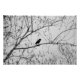 Fotografía en blanco y negro de un pájaro negro encaramado en una rama de un árbol. Las ramas de los árboles tienen semillas colgando de ellas. Las ramas y las semillas crean un fondo abstracto alrededor del pequeño animal negro. Fotografía Copyright ©Kimberly J Tilley.