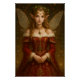 This enchanting work depicts a beautiful fairy adorned with holly in her hair. She wears a crimson dress embroidered with gold. Her serene expression and iridescent wings radiate elegant grace and eternal fantasy. Perfect for lovers of fairy tales, fantasy art, and magical elegance. This artwork was generated by AI based on original human concepts.
