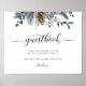 Elegante letrero de libro de firmas con la posibilidad de cambiar el texto para adaptarlo a cualquier evento. Exquisito diseño floral pintado a mano con acuarela en la parte superior con follaje y árbol de pino en tonos azules, azul marino, salvia, gris y verde. Uso de detalles de caligrafía moderna manuscrita y tipografía de bloque. Libro de firmas coordinado disponible. Parte de nuestra colección de bodas y eventos "Montañas Azules Rústicas".