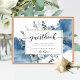 Elegante letrero de libro de firmas con la capacidad de cambiar el texto para adaptarse a cualquier evento. Exquisita acuarela floral pintada a mano con delicada mancha de acuarela azul detrás. Flores y follaje en tonos azul polvoriento, azul marino, blanco, gris y verde salvia. Uso de detalles de caligrafía moderna manuscrita y tipografía de bloque. Libro de firmas coordinado disponible. Parte de nuestra colección de bodas y eventos "Montañas Azules Rústicas".