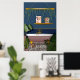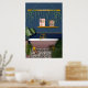 Este diseño azul marino captura el ambiente refrescante de un cuarto de baño con exuberantes plantas verdes, creando un ambiente relajante. La bañera rosa y las baldosas victorianas son el punto fuerte del ilustracion, lo que le da un toque de época.
