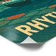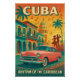 Poster de viajes retro vintage de Cuba. En primer plano: un brillante coche americano clásico de los años 50 de color rosa pastel, estacionado en una calle adoquinada. Zona intermedia: casas coloridas de estilo colonial con balcones, plantas tropicales y líneas de lavandería revoloteando en la brisa.