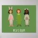 Un lindo ilustracion de tres chicas vestidos con ropa de dormir de pajama disfrazados con un elegante y personalizado color de fondo verde neutro. Este ilustracion personalizado es de tono jovial y sería perfecto para una decoración de habitación joven o chica. El nombre es personalizable.