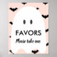 Prepárese para un fiesta Spooktacular con este signo de favores que presenta un fantasma lindo y un fondo de murciélago giratorio. La palabra "favores" está en letras de bloques fáciles de leer mientras que "por favor, tómate una" está en un guión moderno.