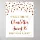 Póster de fiesta de cumpleaños dulce 16 con texto personalizado y confeti rojo y dorado.
