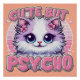 Un gatito mullido con ojos brillantes está adornado con flores rosadas, rodeado por la frase "Cute pero Psicoso" en letras negrita y rosas. Los corazones y las estrellas acentúan el diseño lúgubre y a la vez inquietante.