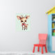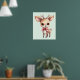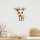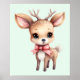 Poster with an illustration of an adorable baby deer. Big eyes big ears with a large head and little brown antlers. Wearing a big red bow.