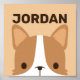 This design features cute little corgi dog cartoon illustration with personalized name in brown modern sans serif font style on light brown background.