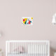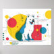 A dog with blue and white fur sits among colorful shapes and lines in an art-inspired design. The scene has vibrant colors and a playful vibe.
