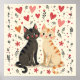 Two cute cats, one dark and one light-colored sit happily beside each other surrounded by hearts and flowers in a retro design.