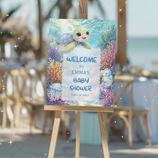 Cute Sea Turtle Boy Baby Shower Welcome Poster. Matching items available.