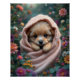 Cute little fluffy Maltese puppy wrapped in a blanket surrounded by delicate vintage flowers. Perfect wall decor for children's room! Natural colors, green, playful and romantic.