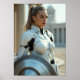 Athena as a tactical operator, wielding a high-tech energy bow that symbolizes precision and mechanical genius.