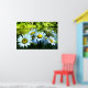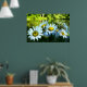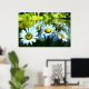 Es un día brillante y soleado. Cinco margaritas salvajes con alegres centros amarillos y pétalos blancos están en primer plano. A lo lejos hay un estanque resplandeciente rodeado de arbustos y árboles verdes. Alguien podría deambular y recoger cada pétalo mientras dice "me ama, no me ama".
