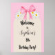 Daisy Flower and Bow Birthday Welcome Poster. Personalize your birthday party with a custom sign! This adorable pink floral design features white daisies with golden yellow centers and soft watercolor-style pink bows with a pastel pink background. This charming feminine aesthetic is perfect for a girly party. The daisy and bows create a playful cottagecore vibe that is both trendy and timeless. The sweetest modern birthday sign for your birthday girl.