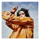 Un retrato cautivador que muestra a una mujer con el pelo rizado, parcialmente ocultado por una chaqueta naranja, ambientado en el fondo de un cielo azul chillón. La imagen destaca con un estilo geométrico y poligonal único, que le da un toque de arte abstracto y digital a la escena. Su pose es dinámica y expresiva, creando un sentido de movimiento y energía. El contraste entre los cálidos tonos naranjas de su chaqueta y el azul fresco del cielo le da profundidad a la composición, combinando la moda con un toque artístico moderno. Ideal para aquellos que buscan una fotografía de retrato visual y contemporánea con un borde abstracto.