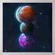 Esta imagen representa una escena surrealista de cuatro planetas apilados unos encima de otros en una danza cósmica. Los planetas están adornados con colores vibrantes y patrones intrincados, lo que crea un espectáculo fascinante contra el telón de fondo de un cielo estrellado. La obra evoca un sentido de asombro y misterio, invitando a los espectadores a contemplar la vastedad y belleza del universo.