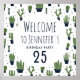 Poster de bienvenida de cumpleaños con un sabor rústico occidental. Diseñado con un montón de cactus verdes lindos en un patrón repetido. Específicamente, cactus espinosos de color verde, en todo tipo de formas y tamaños, cada uno sentado en su propio maceta de flores azul oscuro. Pequeños triángulos decorativos entre ellos. Un ilustracion divertido y sensacional.