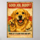 Dos Golden Retrievers alegres entregan ánimo con un giro divertido. El diseño retro angustiado, combinado con baldosas de baño rojas y azules en negrita, hace que este póster sea encantador y divertido. Un regalo perfecto para amantes de los perros, familias o cualquiera que quiera que la decoración de su baño provoque una sonrisa.