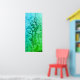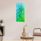 Esta obra de arte es una pieza vertical abstracta con un gradiente de azules y verdes. Los colores pasan sin problemas de un azul profundo y apacible en la parte superior a un verde vibrante en la parte inferior. Una línea blanca distintiva recorre directamente el centro de la pieza, añadiendo un sentido de profundidad y división. La textura superficial es rica, con formas circulares y orgánicas esparcidas por todo el mundo, dando un sentido de fluidez y movimiento. El efecto general es sereno y reminiscente de escenas submarinas o texturas naturales.