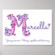 Hermoso arte de monograma M con cartel de nombre perfecto para el dormitorio o sala de juegos de una niña en tonos de blanco, rosa y morado. Personalice con el nombre de su hijo que comience con M, y el significado del nombre para un toque verdaderamente personalizado en el dormitorio o guardería de su hijo, este ejemplo es para el nombre Marcella Joven guerrera. Fuerte, capaz y deslumbrante. Impresión de cartel lindo ideal para el dormitorio de una niña o para un nuevo bebé, regalo de bautizo o baby shower. © Letra única M monograma de corazones y flores descripción del dibujo y diseño gráfico de Sarah Trett. www.sarahtrett.com para www.mylittleeden.com