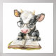 Cuidada vaca blanca y negra usando gafas y leyendo un libro. Ideal para que su hijo motivador lea. También sería un buen regalo para un profesor para el aula. Decoración de vivero cuadrado de 12" x 12". Gráfico asistido por IA adquirido con licencia comercial. Material gráfico: MokoDE