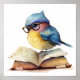 Pequeño pájaro azul y amarillo lindo con gafas y leyendo un libro. Ideal para que su hijo motivador lea. También sería un buen regalo para un profesor para el aula. Decoración de vivero cuadrado de 12" x 12". Gráfico asistido por IA adquirido con licencia comercial. Material gráfico: MokoDE